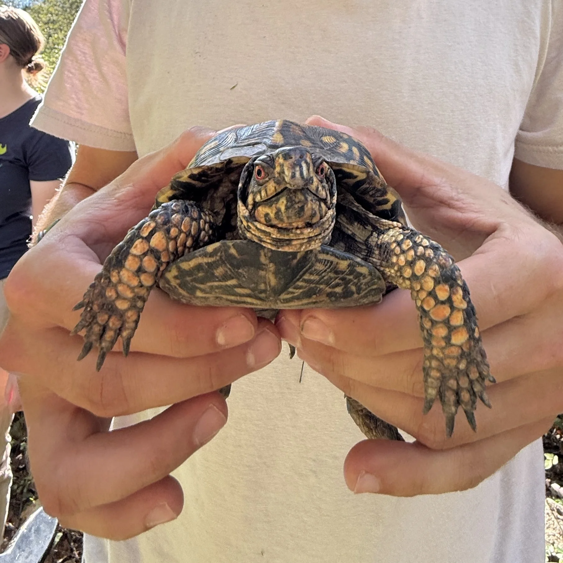 Our subject for this assignment was Kenneth. Kenneth the Eastern Box Turtle (Terrapene carolina carolina) was equipped with a radio tracker and it was our time to locate him using radio telemetry. We were using a strategy called triangulation, where we take readings from separate points to determine the direction of the signal. We began along the fence line of SCBI in an area aptly named Kenneth’s Hollow. We picked up a signal far down the hill and began to head down towards the signal. Each time we picked up a signal, we recorded the GPS coordinates and the heading using a compass. After about three headings we began to narrow down Kenneths location. Unfortunately as we drew near, we realized Kenneth was in a bush, but not just any bush, a bush comprised of 99% thorns. After about 12 and half thorns entered by arms and back, a classmate exclaimed that they had seen Kenneth. Finally the hunt was over, and I could retreat to my room to bathe myself in Neosporin.